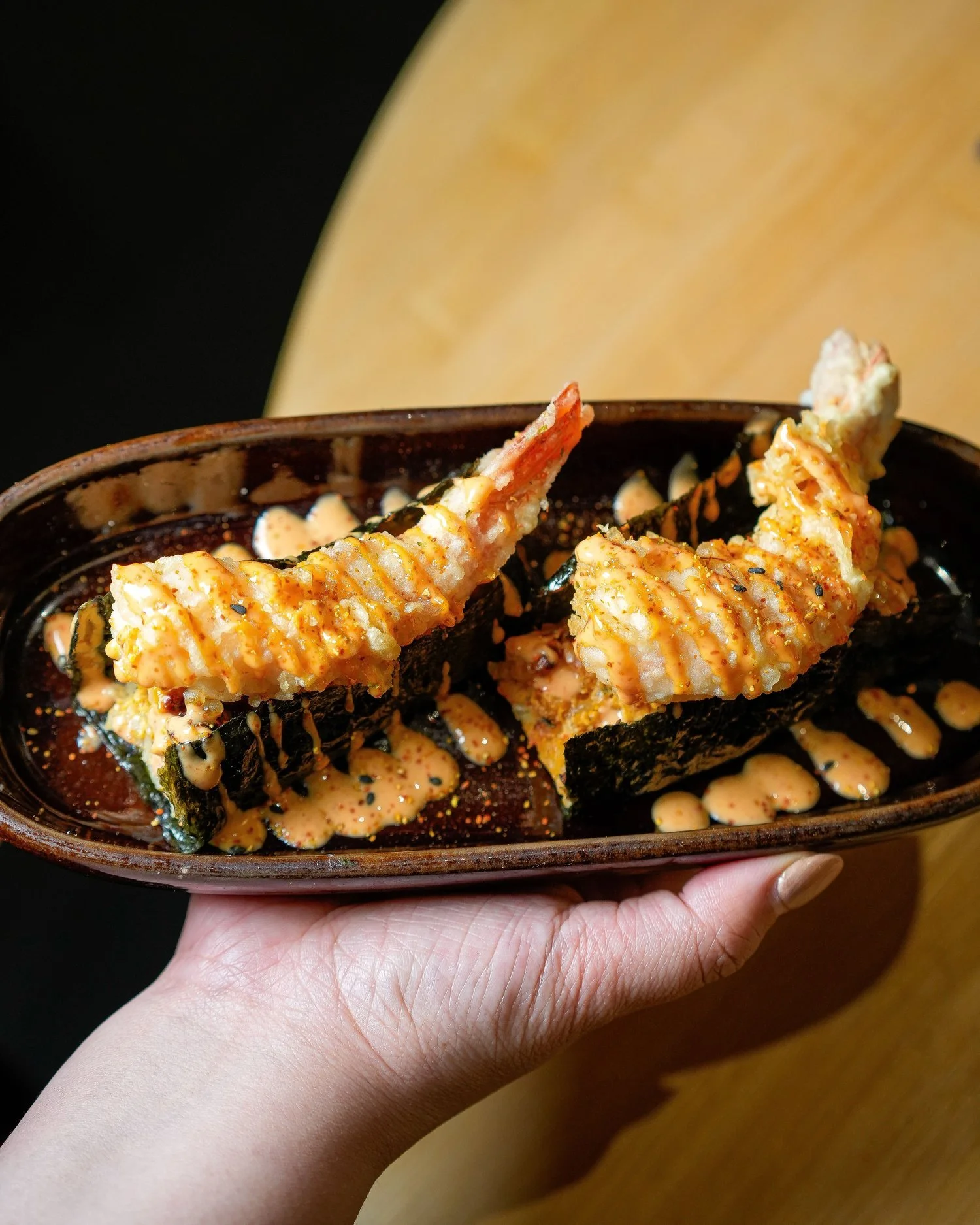 The King’s Temaki is a tasty combination of fresh and flavourful ingredients, including crispy king prawn tempura, cream cheese, with bagoong (fermented shrimp) aioli, and all wrapped up in a delicate nori sheet. The dish is then topped with a drizzle of sweet sauce and a sprinkle of sesame seeds. It's a fusion of flavours that will leave your taste buds wanting for more.