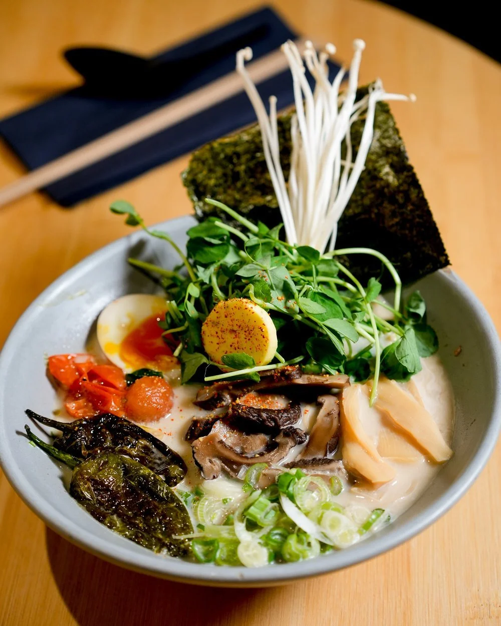 If you're a vegetarian seeking a culinary adventure, look no further than our Miso Mushroom Ramen. Immerse yourself in a bowl of perfection, with a creamy mushroom broth that's infused with shiitake and porcini mushrooms. Toppings such as niitamago egg, enoki mushrooms, roasted tomatoes, nori, and padron peppers add layers of texture and flavor. The garlic & herb compound butter dances with the Tokyo noodles, creating a symphony of indulgence that's both satisfying and wholesome.